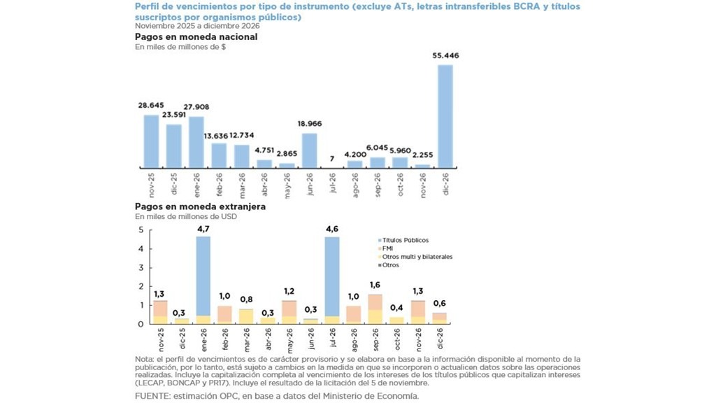 Los vencimientos previstos para el periodo noviembre 2025 a diciembre 2026 ascienden a $211.111.428 millones para la deuda en pesos y USD21.094 millones para la pagadera en moneda extranjera.